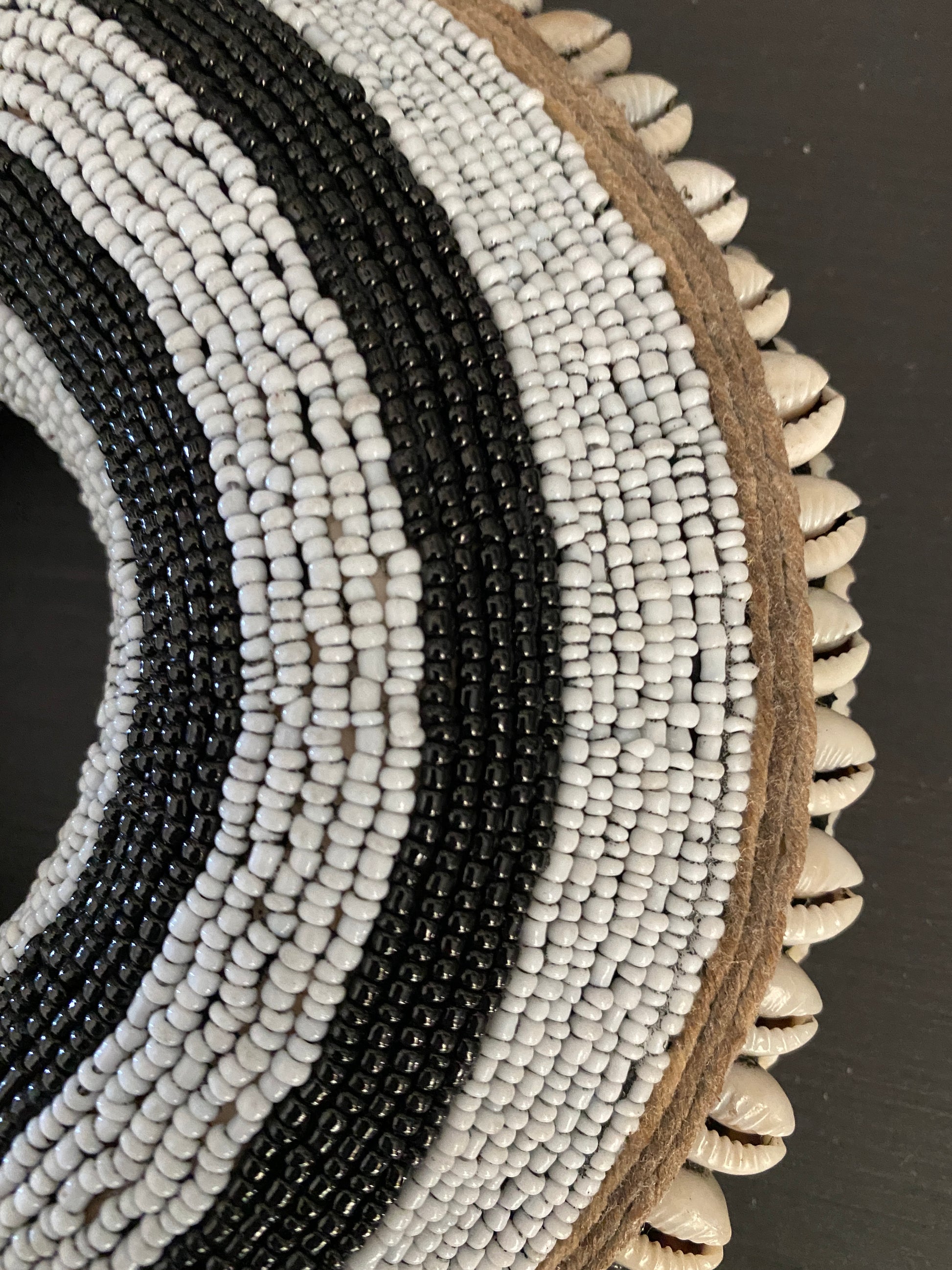 This terracotta clay item, enhanced with black and white glass beads and edged in cowrie shells, is one-of-a-kind, imported from Africa and hand-crafted by a group from Cameroon.