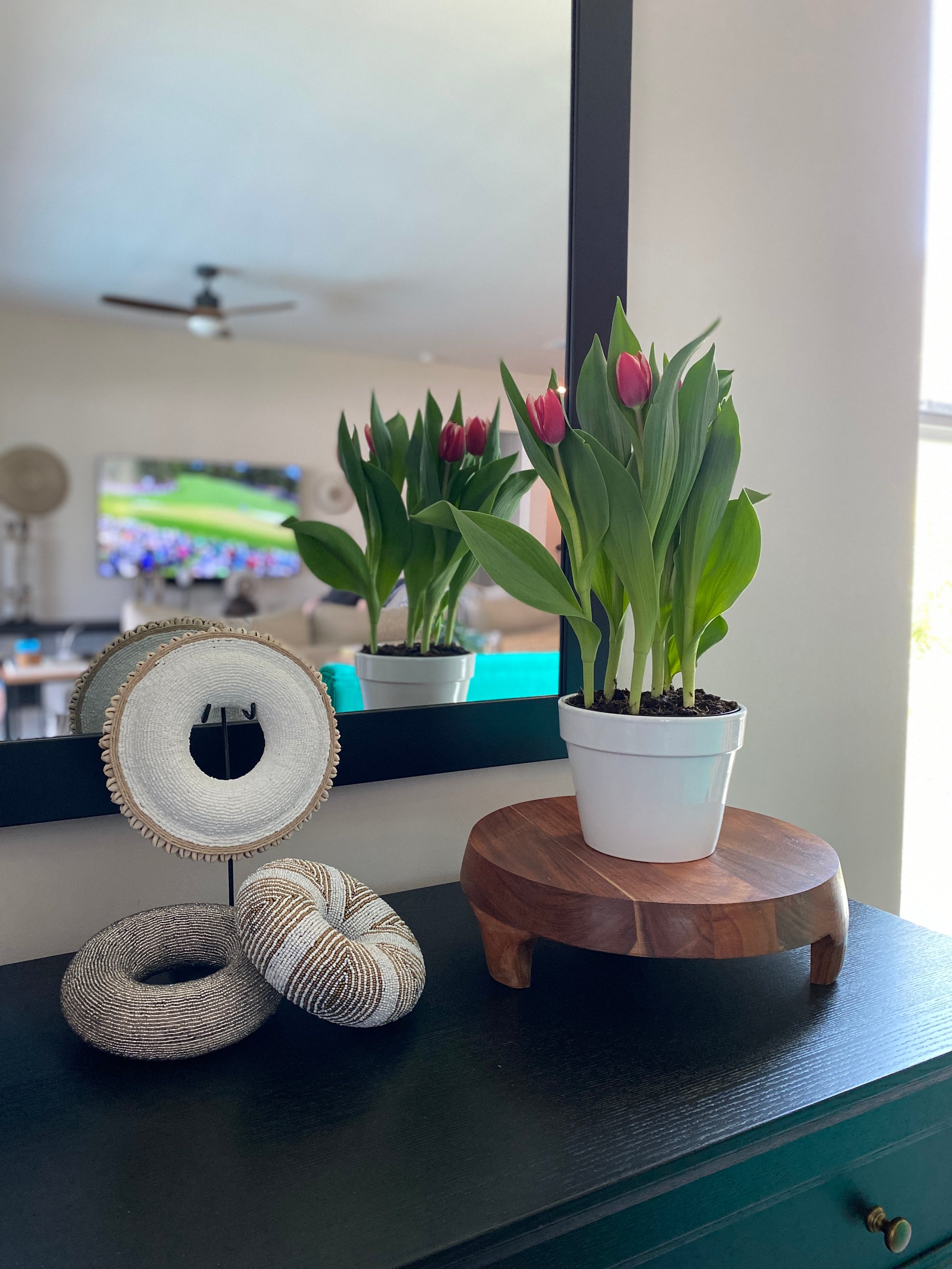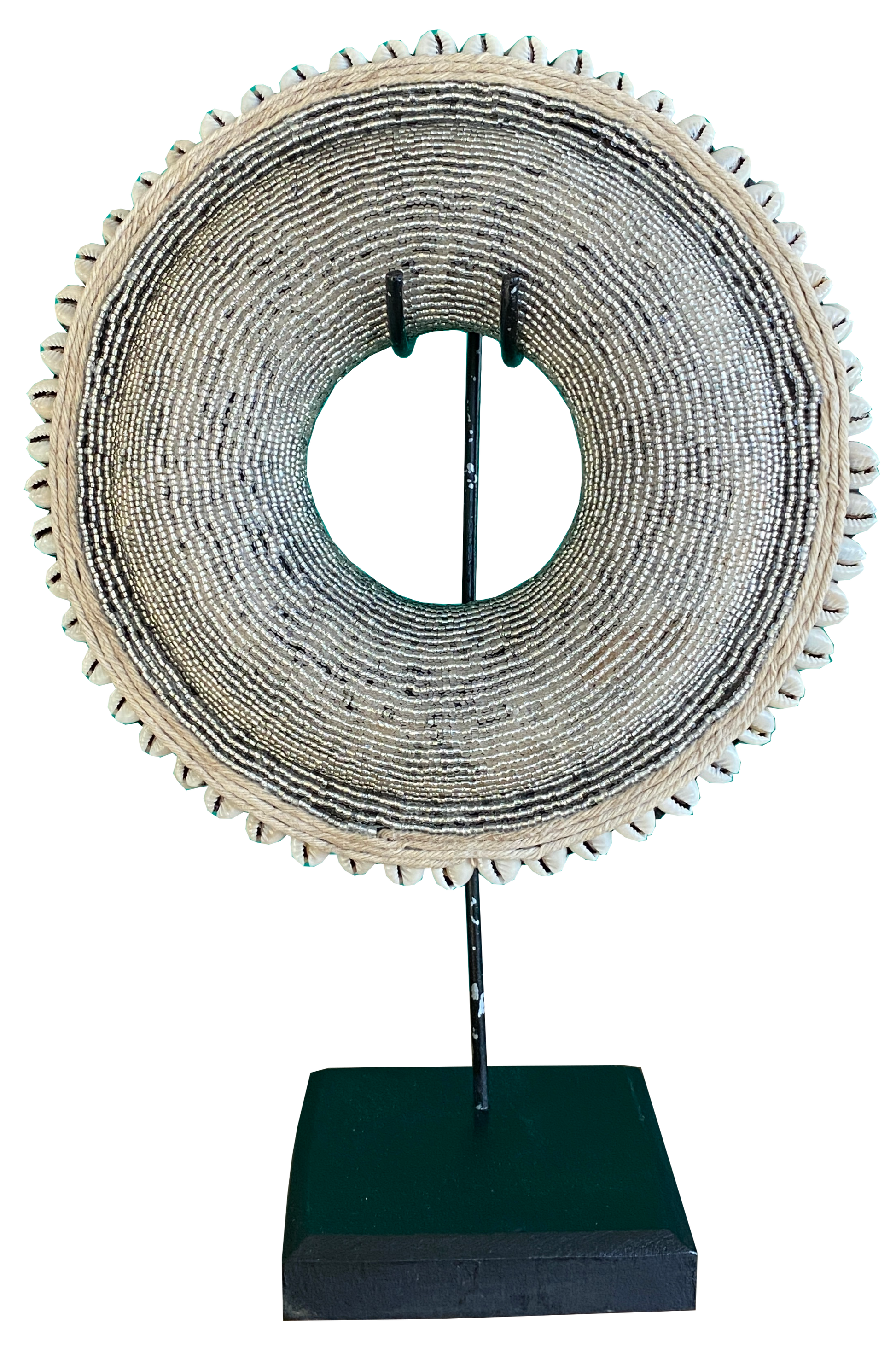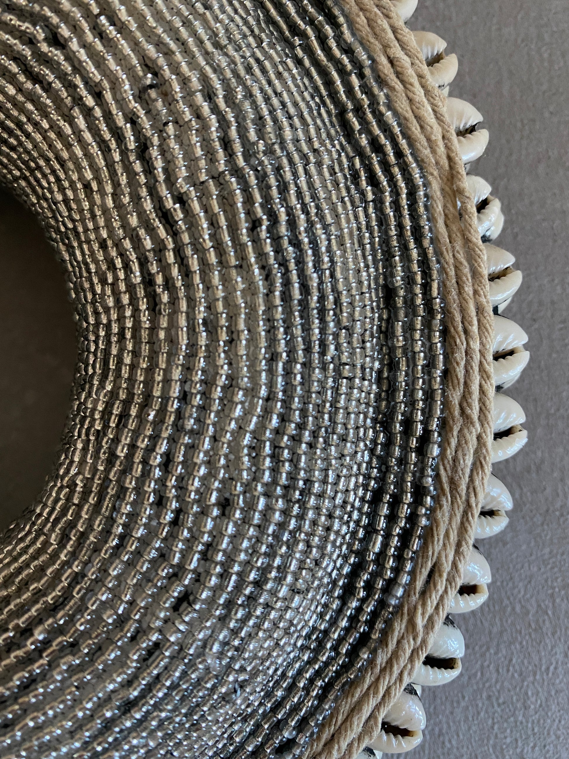 This terracotta clay item, enhanced with silver glass beads and edged in cowrie shells, is one-of-a-kind, imported from Africa and hand-crafted by a group from Cameroon.