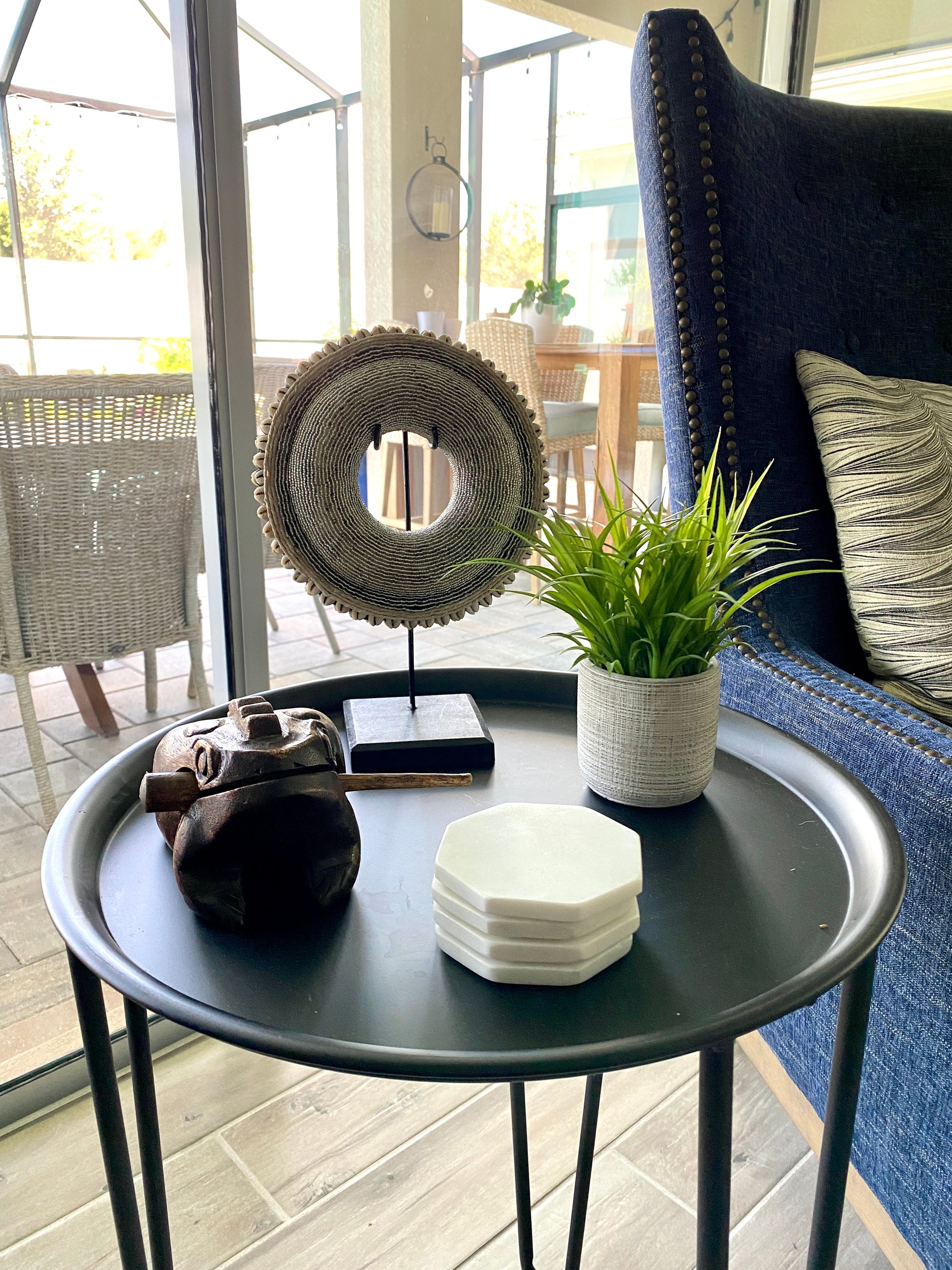 High-end decorative disc approximately 8 inches in diameter and 11.5 inches high on the stand .