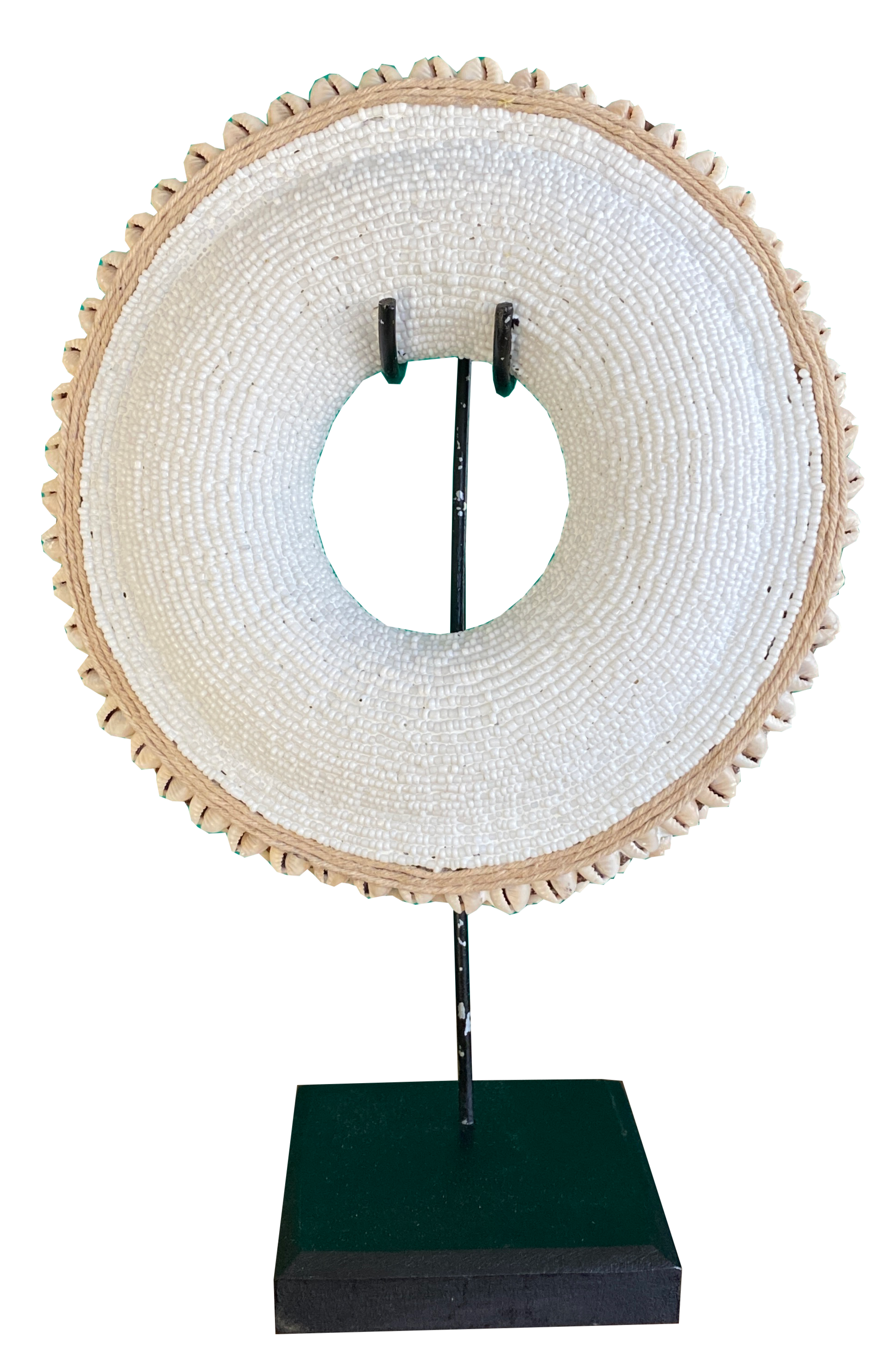 This terracotta clay item, enhanced with white glass beads and edged in cowrie shells, is one-of-a-kind, imported from Africa and hand-crafted by a group from Cameroon.