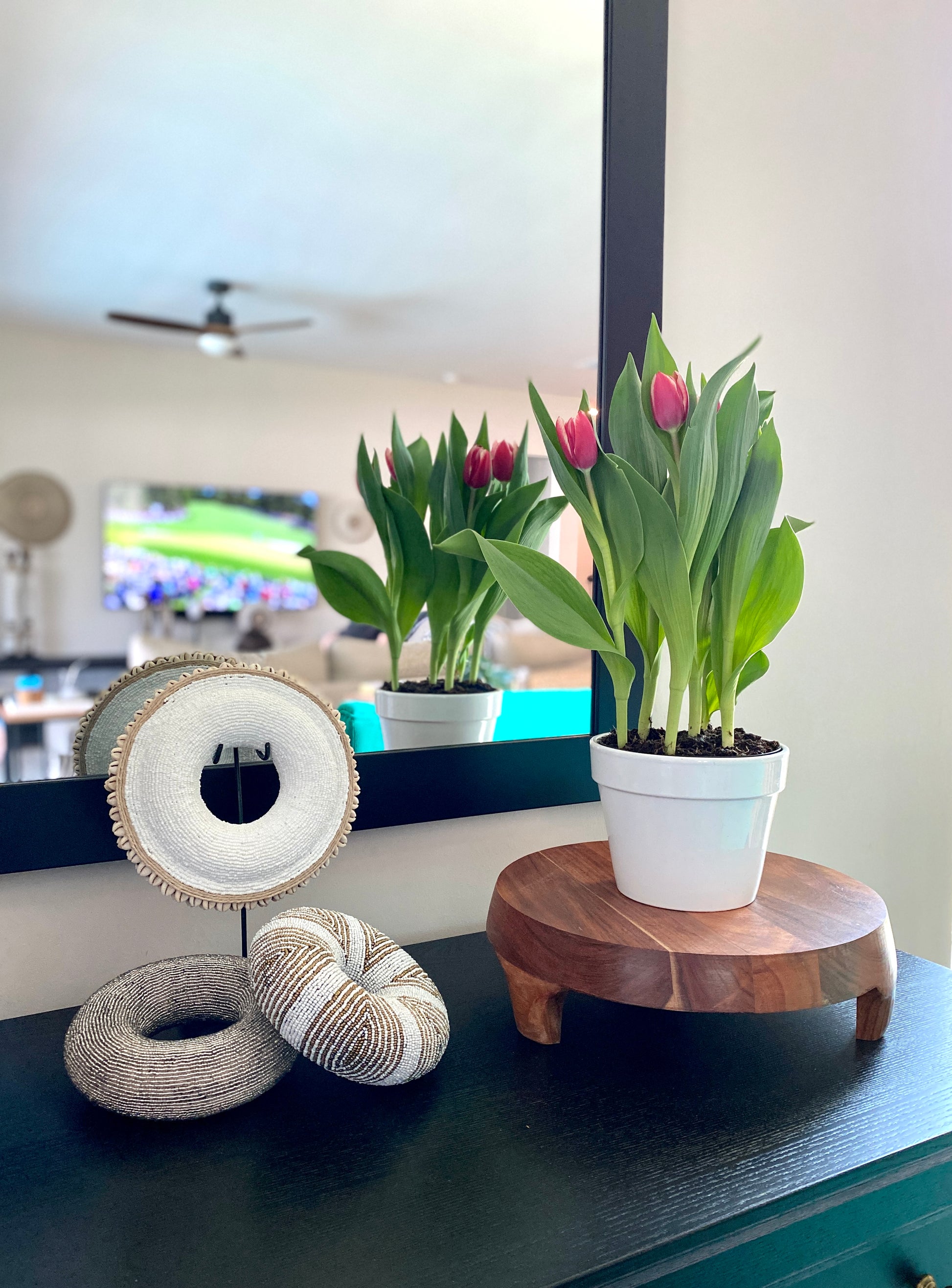This terracotta clay item, enhanced with black glass beads and edged in cowrie shells, is one-of-a-kind, imported from Africa and hand-crafted by a group from Cameroon.