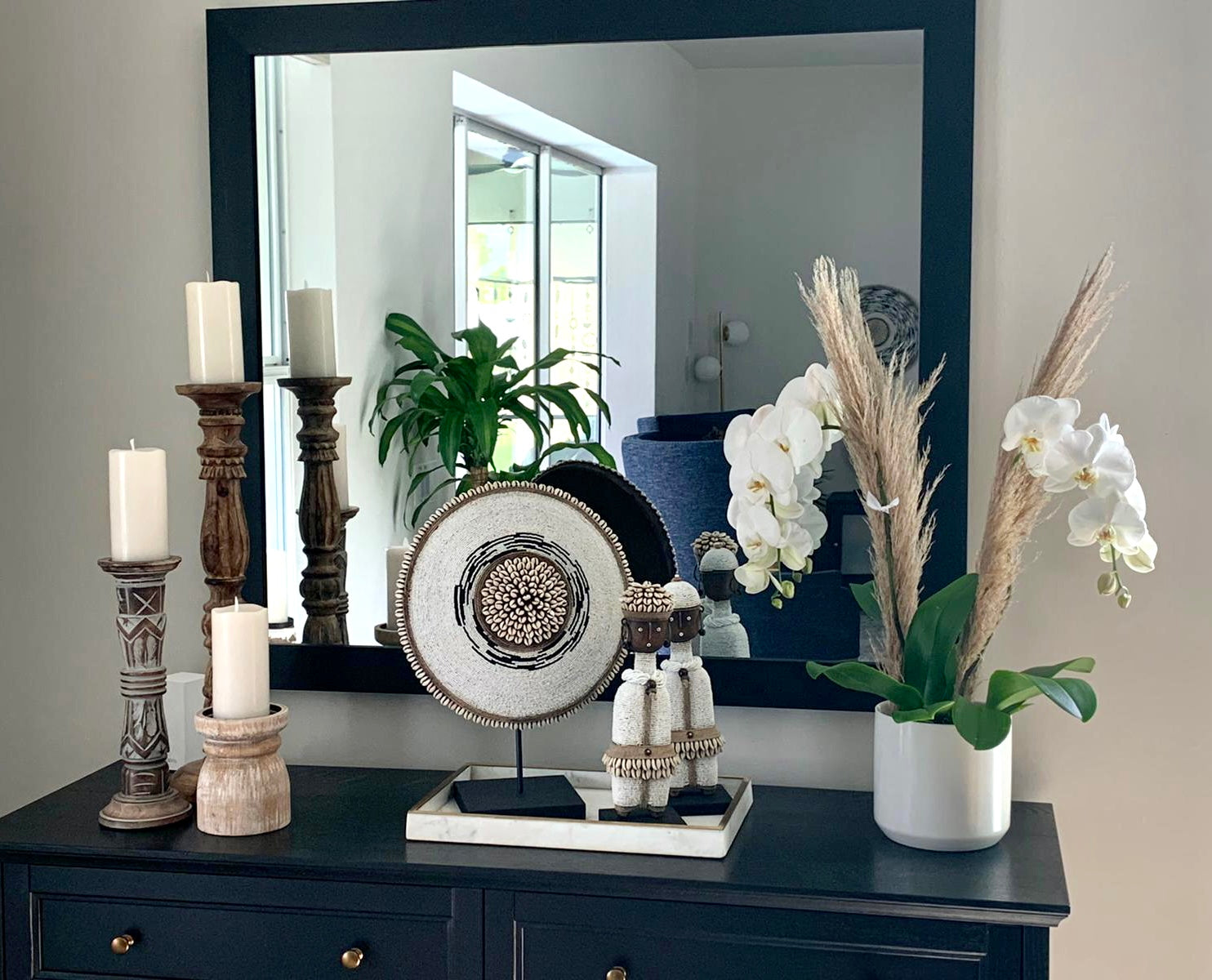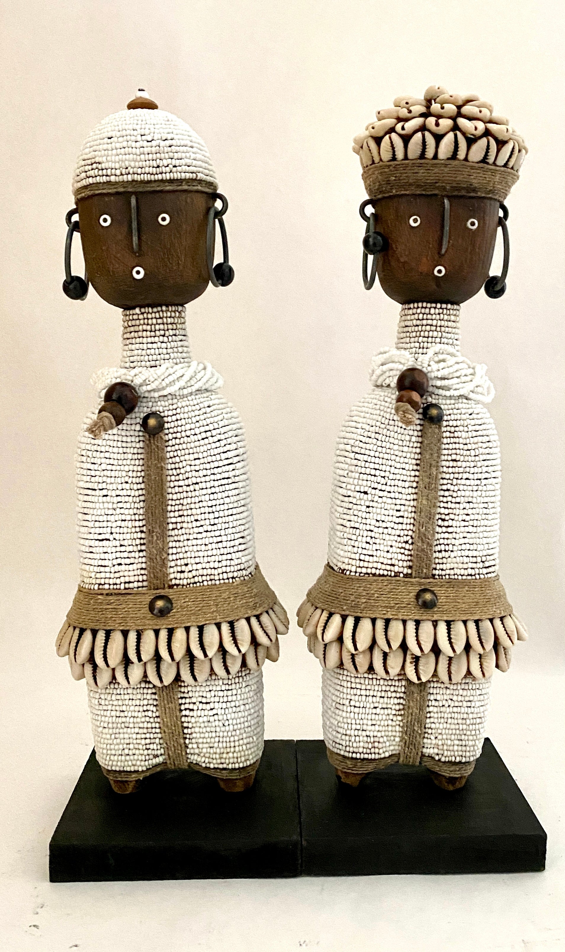 Sold as a pair, these uniquely crafted dolls are carved from Kola wood, and decorated with white glass beads, cowrie shells, twine and metal. The dolls are secured on wooden bases and are approximately 12 inches tall.