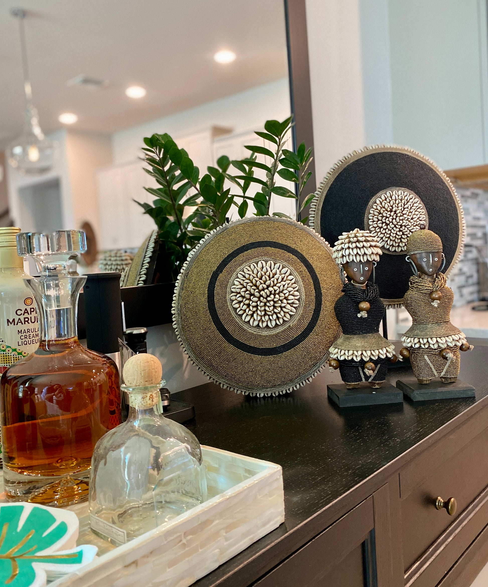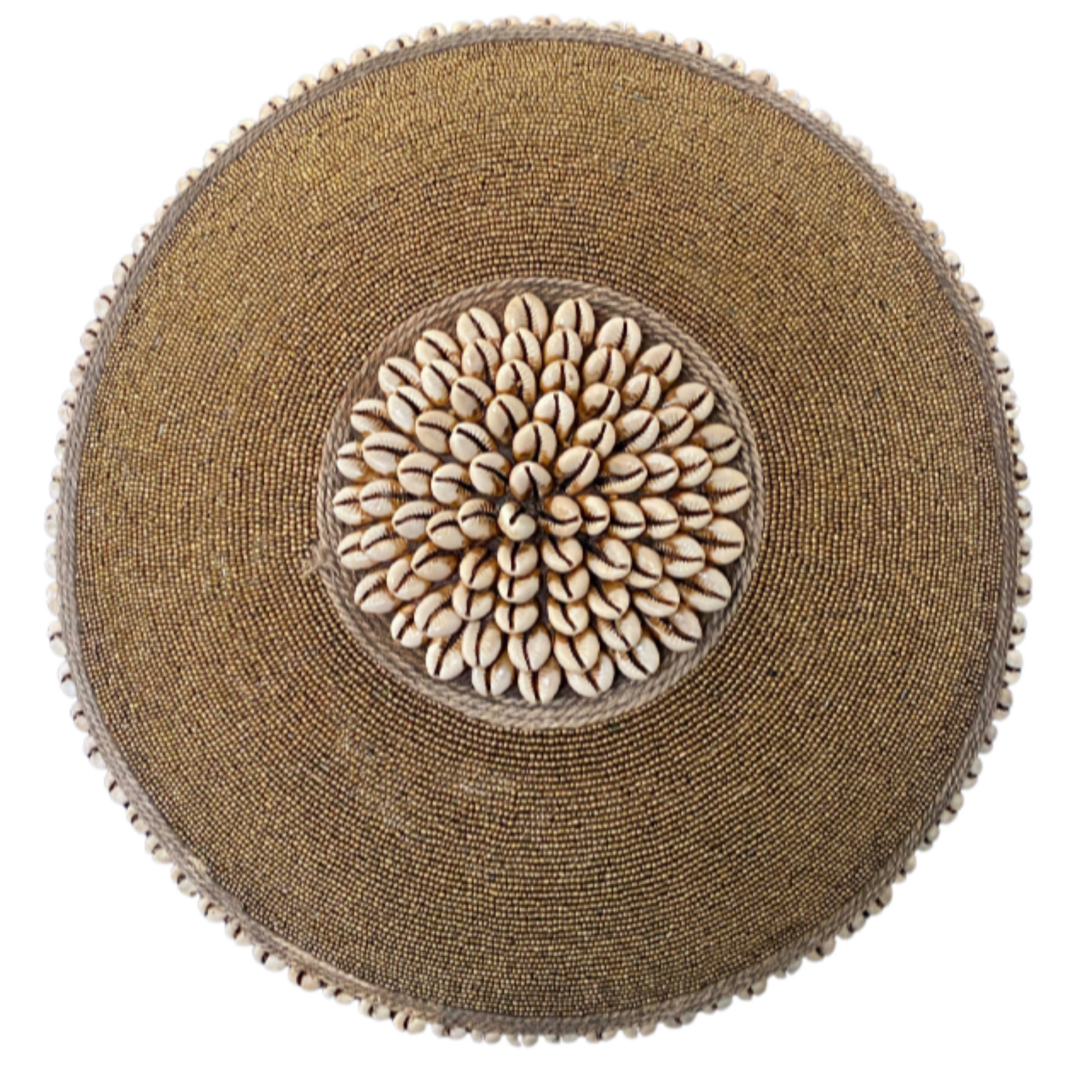 This wall décor is carved from Kola wood, enhanced with gold glass beads and edged in cowrie shells. Each piece is one-of-a-kind, imported from Africa, and handmade by a group from Cameroon in the tradition of the Tikar tribe. Originally a defensive weapon, these pieces are now used decoratively as symbols of status and wealth.
