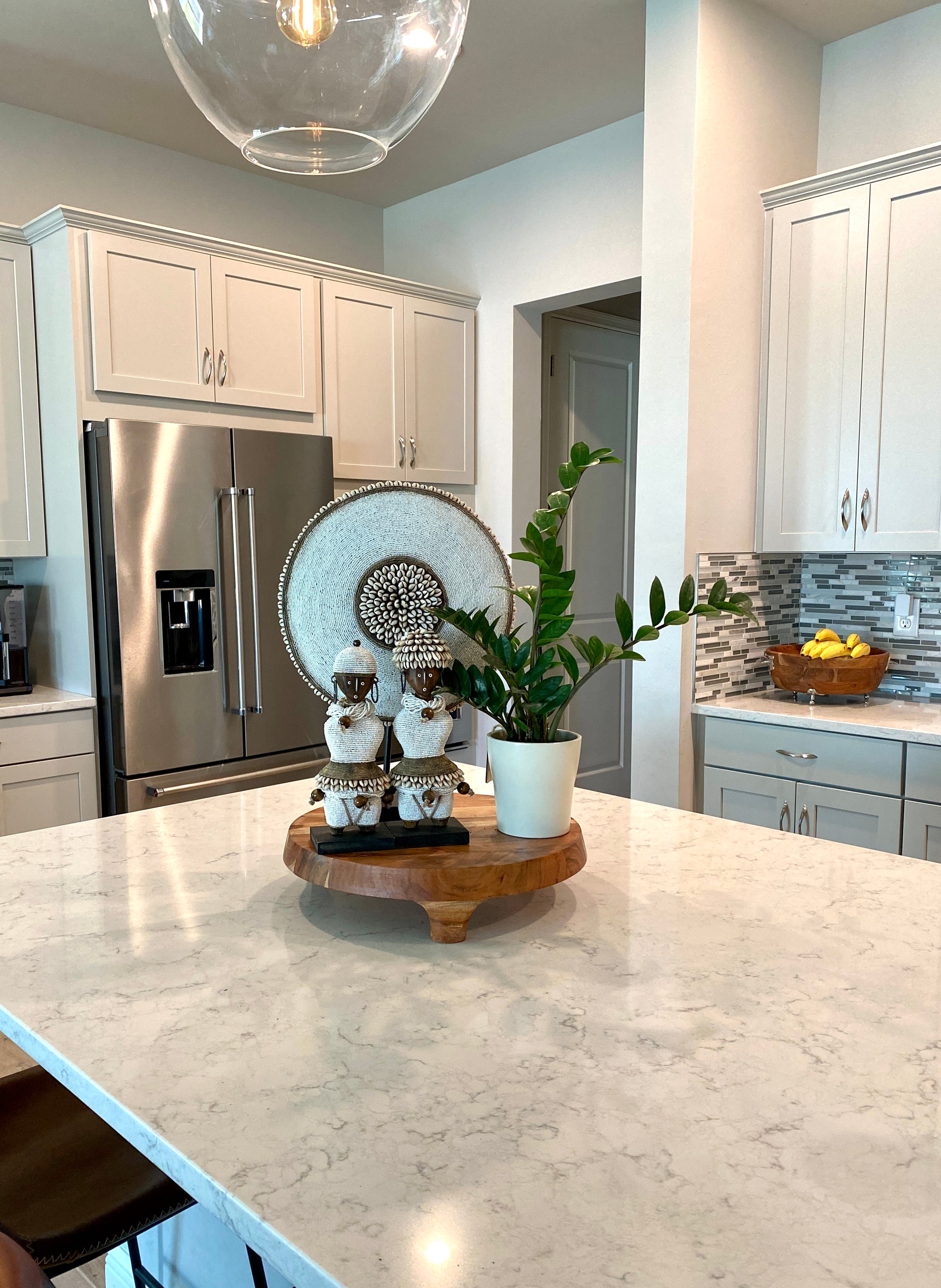 This piece is hand-carved from Kola wood, enhanced with gold glass beads and adorned with cowrie shells. Each piece is one-of-a-kind, imported from Africa, and handmade by a group from Cameroon in the tradition of the Tikar tribe. Originally a defensive weapon, these pieces are now used decoratively as symbols of status and wealth.