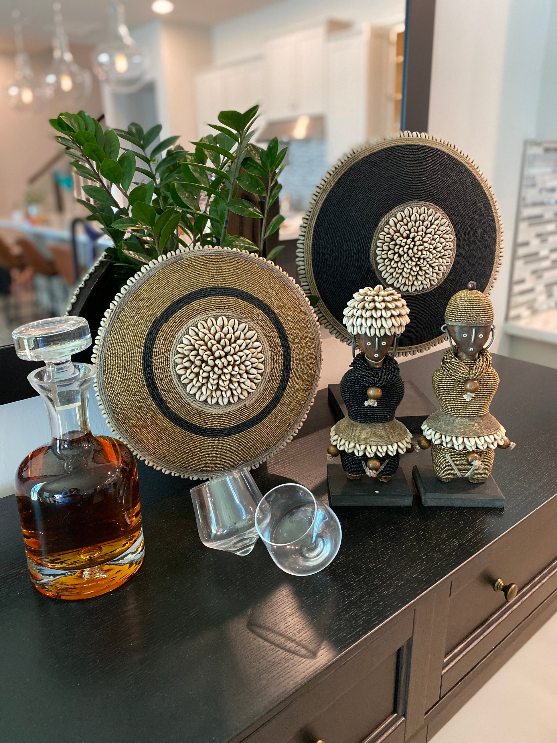 This wall décor is carved from Kola wood, enhanced with white glass beads and edged in cowrie shells. Each piece is one-of-a-kind, imported from Africa, and handmade by a group from Cameroon in the tradition of the Tikar tribe. Originally a defensive weapon, these pieces are now used decoratively as symbols of status and wealth.