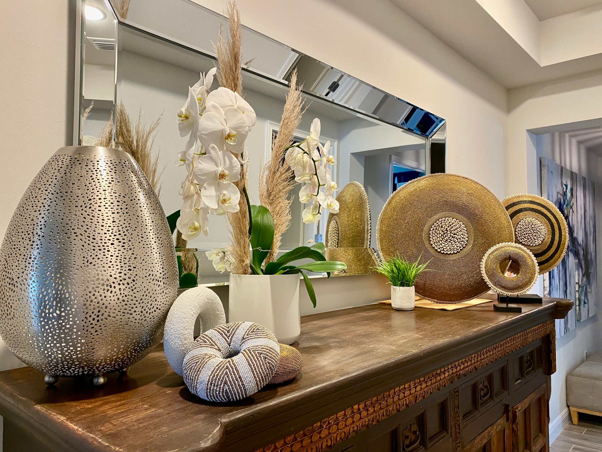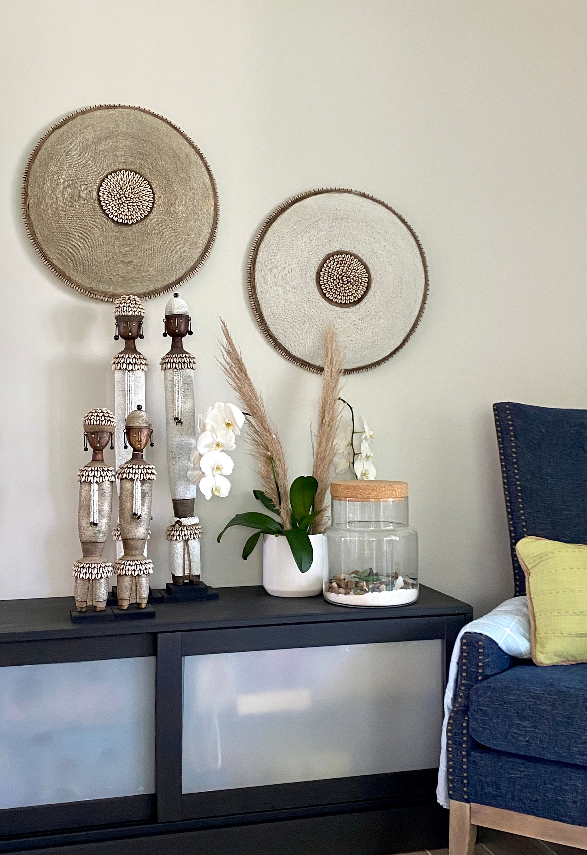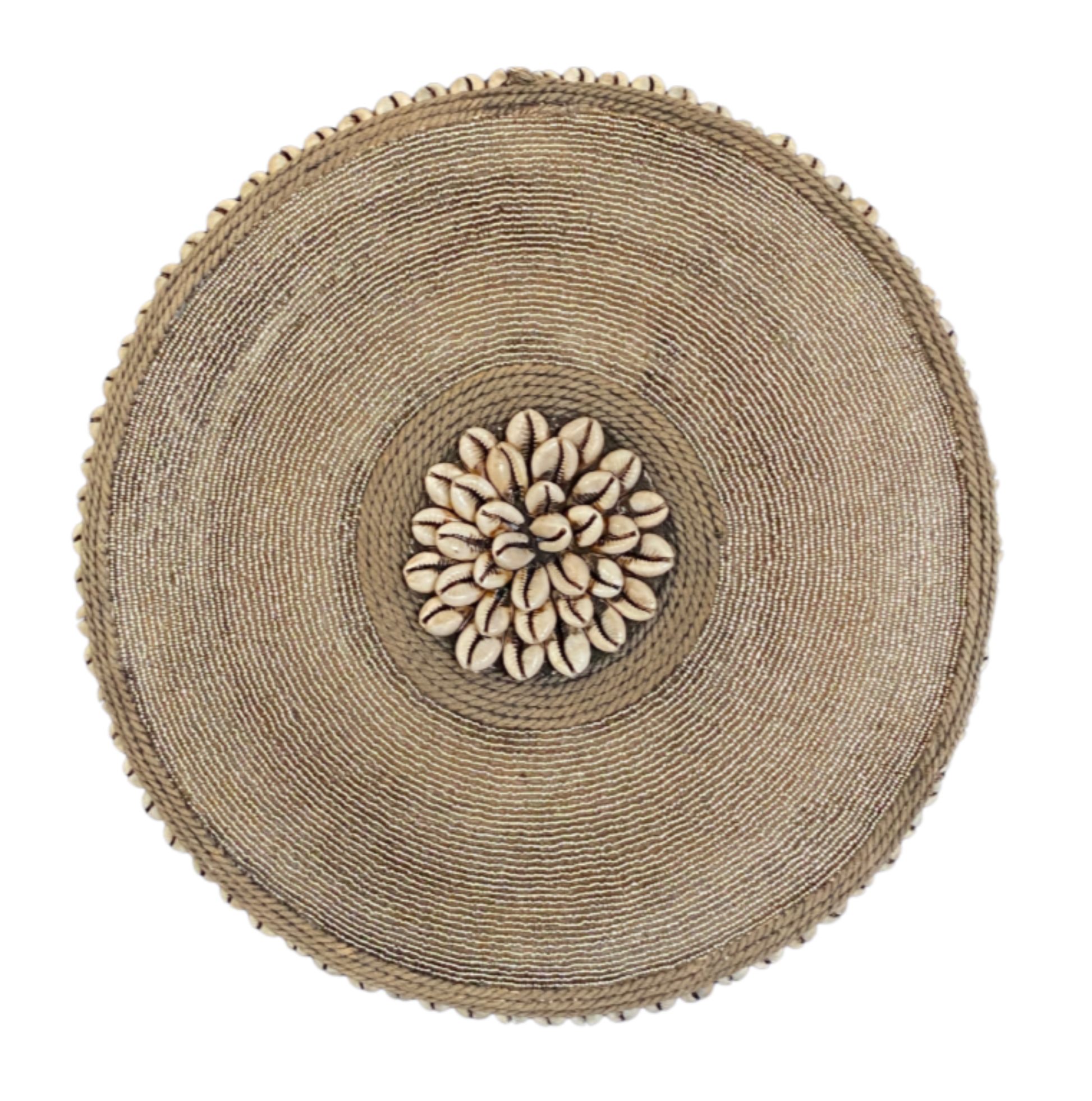 This wall décor is carved from Kola wood, enhanced with silver glass beads and edged in cowrie shells. Each piece is one-of-a-kind, imported from Africa, and handmade by a group from Cameroon in the tradition of the Tikar tribe. Originally a defensive weapon, these pieces are now used decoratively as symbols of status and wealth.